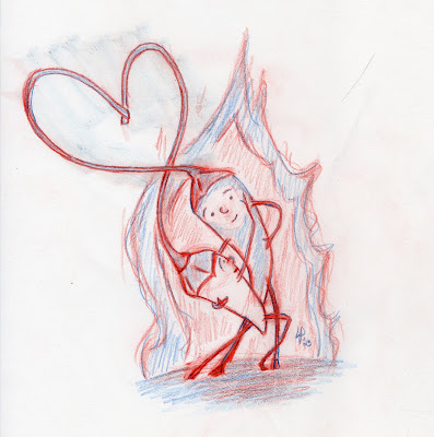 I had three ideas written down for it in my note. Since I wasn't bound to the one single-week parameters of the original Illustration Friday format, I decided to illustrate all three. All three ideas involved peppers; peppers in action. Speaking of action... When I was having my picnic lunch, I had brought a book on reading tarot (as I'm learning it) and happened to be reading about the minor arcana of wands. Wands are aligned with the element of fire and they represent action in the tarot. Just a funny coincidence that I'd be reading about fire and action after just visually conceptualizing SIZZLE as fire and actions.